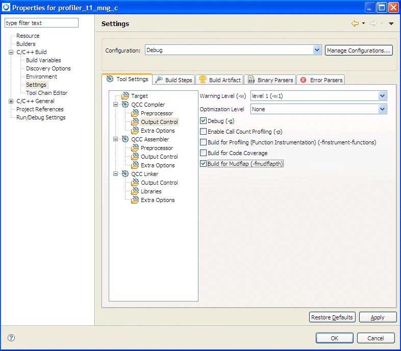 To use Mudflap in the IDE, you'll need to select Mudflap options to add the -fmudflapth option to the compiler command line for your application. There is a runtime library attached to the process called libmudflap that is controlled by runtime options that are automatically set in the MUDFLAP_OPTIONS environment variable (set when the Mudflap tool is added to the Launch Configuration; the Mudflap options are set there.) The instrumentation relies on this separate libmudflap runtime library that is linked into a program when the compile option (-fmudflap) and linker option (-lmudflap) are selected for the application. Note that both the QNX and Managed projects use the -fmudflapth option for the compiler and linker because this option supports threads (-fmudflap doesn't work with threaded programs.) This means that for multithreaded applications, you'll use -fmudflapth for the compiler, and -fmudflapth -lmudflapth for the linker.